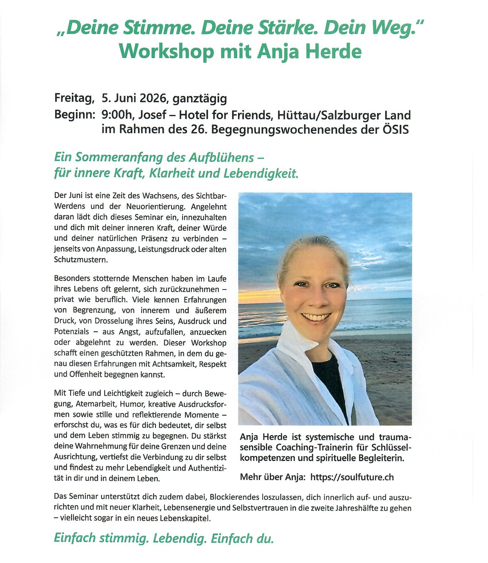 Titel: „Deine Stimme. Deine Stärke. Dein Weg. Ein Sommeranfang des Aufblühens – für Deine innere Kraft und Lebendigkeit.“